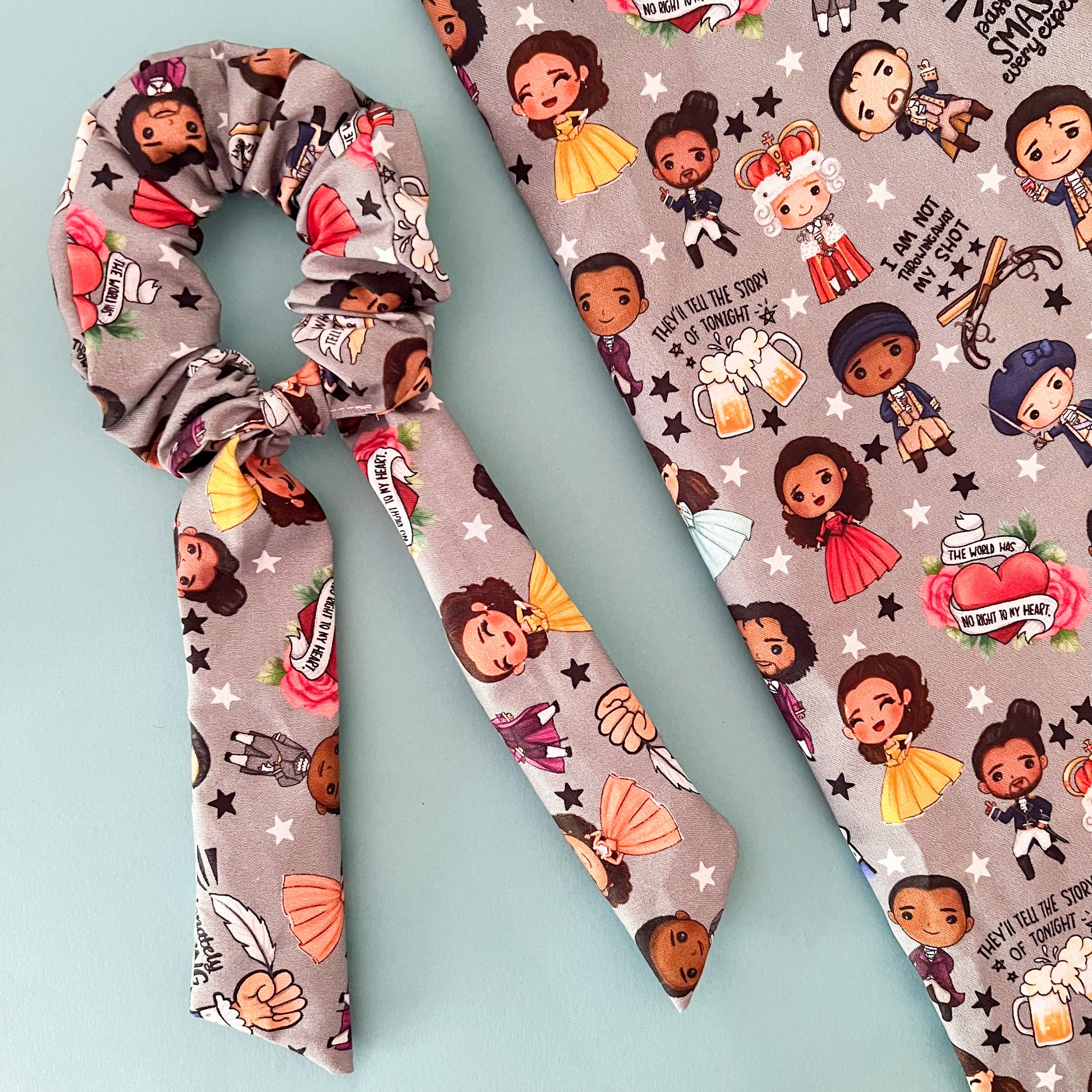 Celebrate your love for the greatest musical with this amazing Hamilton theme scrunchies, featuring characters and quotes on a soft grey background! Made of 100% cotton and strung with braided elastic.