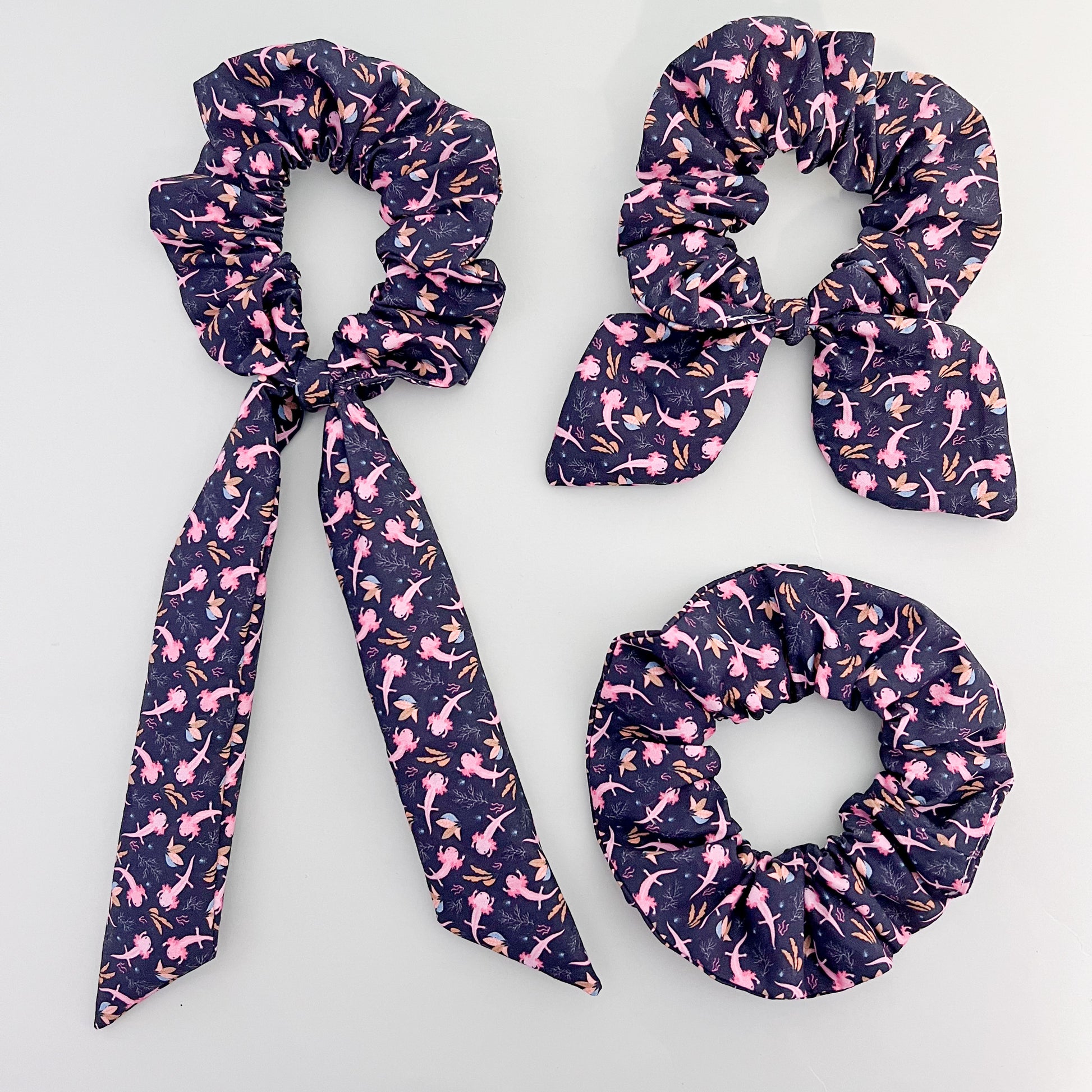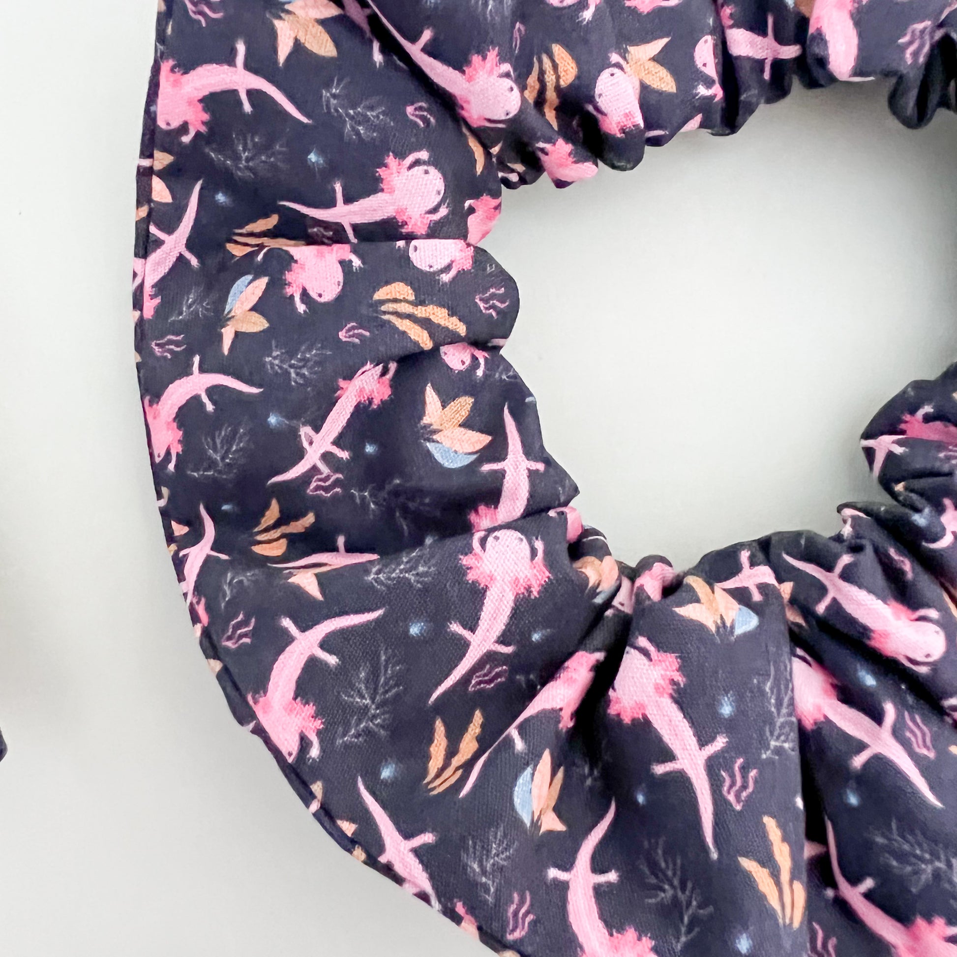 Cotton scrunchie featuring axolotls on a navy blue background in your choice of design! Made of 100% cotton and strung with braided elastic.