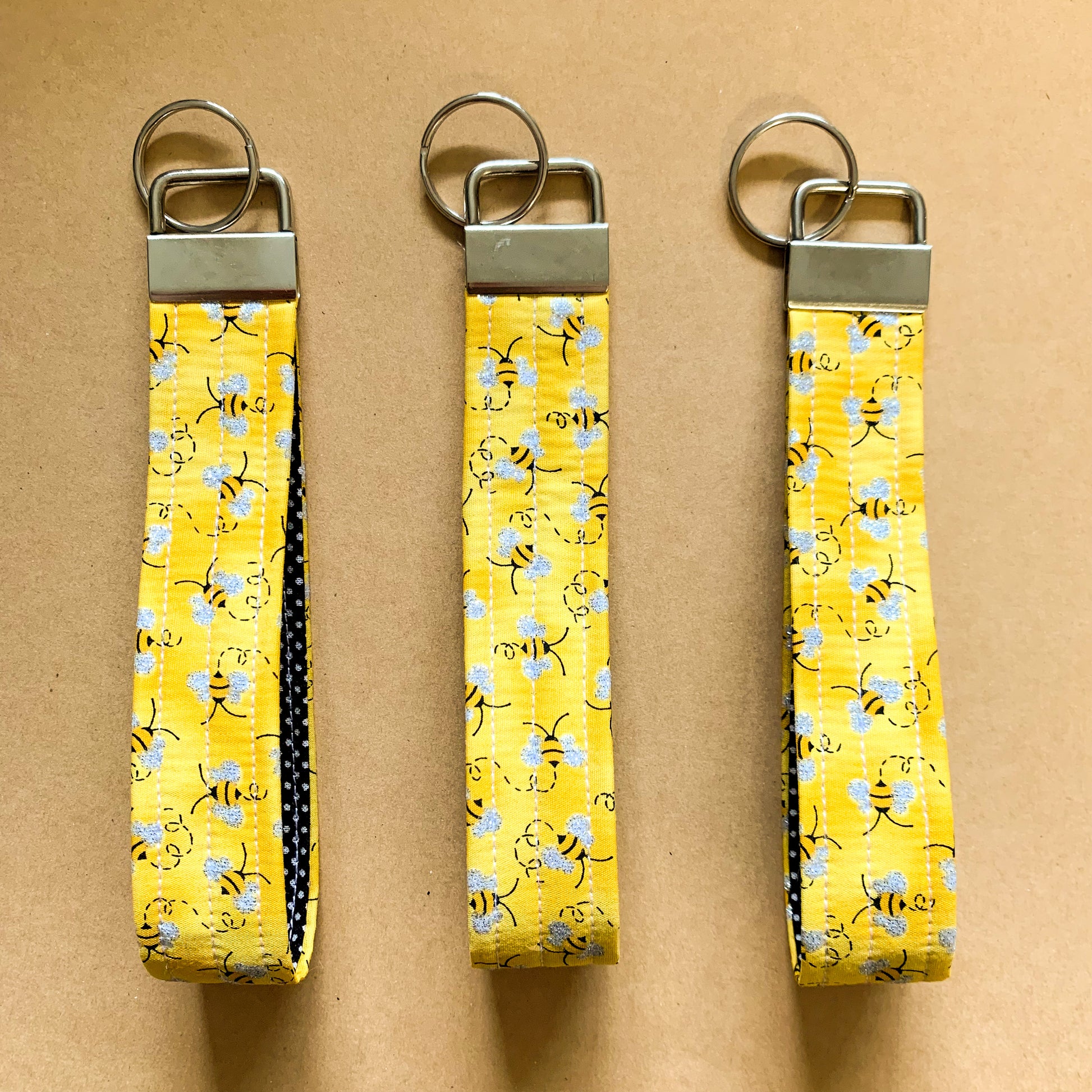 This keyfob will ensure you don’t lose your keys in the bottom of your bag! Featuring bees on a yellow background, and lined with a black and white spot inner lining.