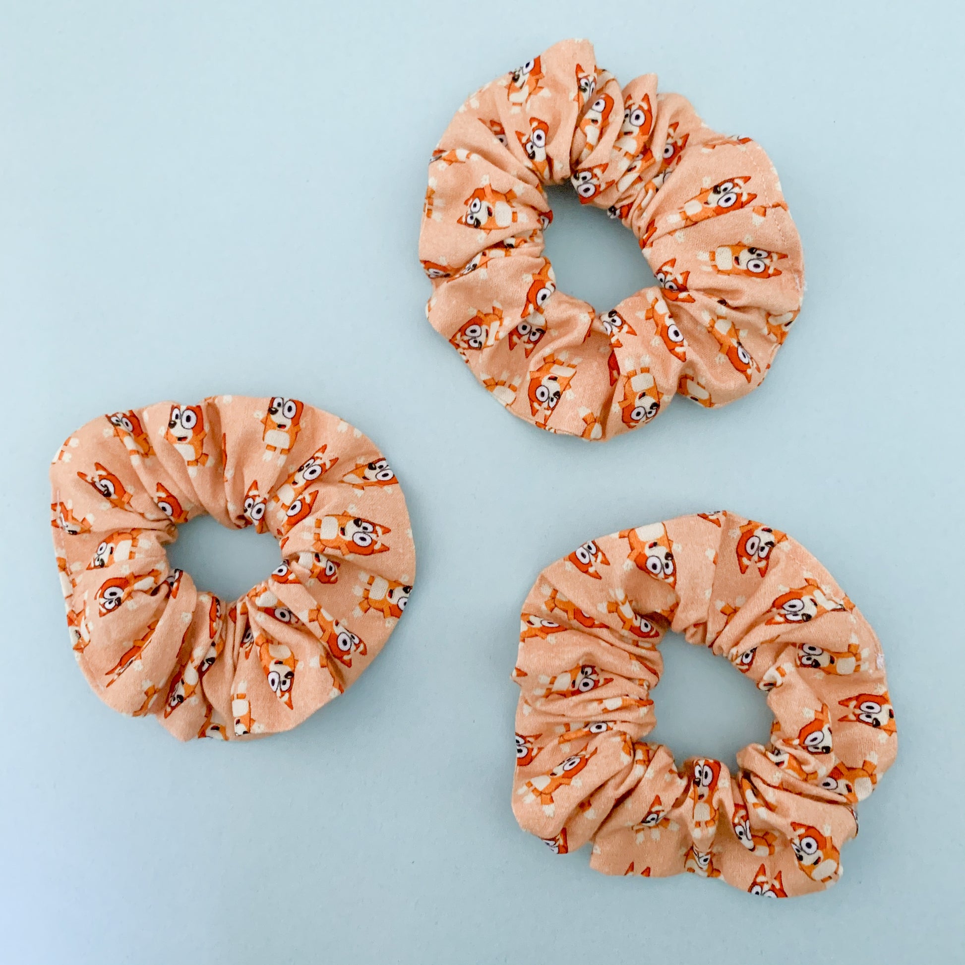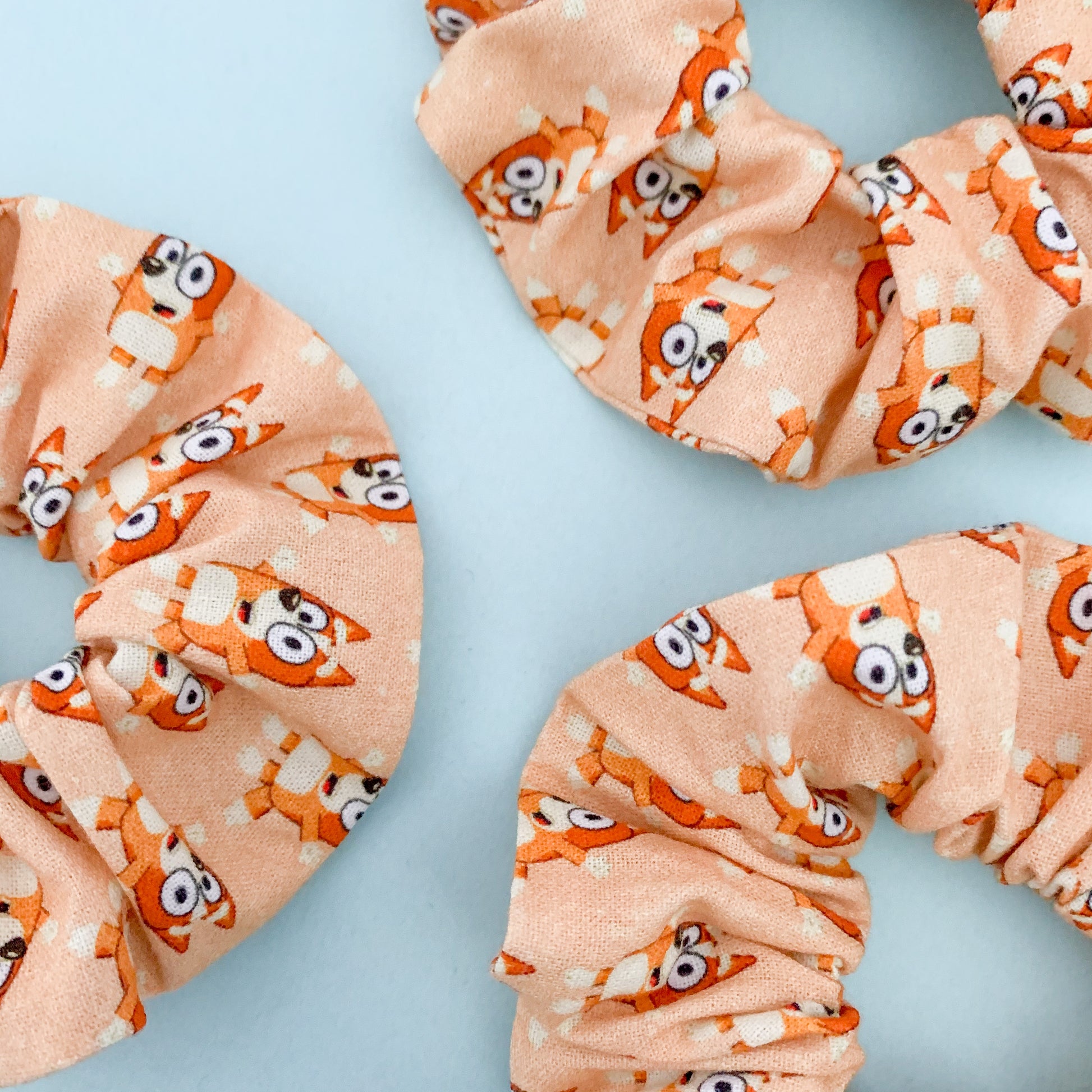 Handmade cotton scrunchie featuring Bluey’s little sister, Bingo, on an orange background.
