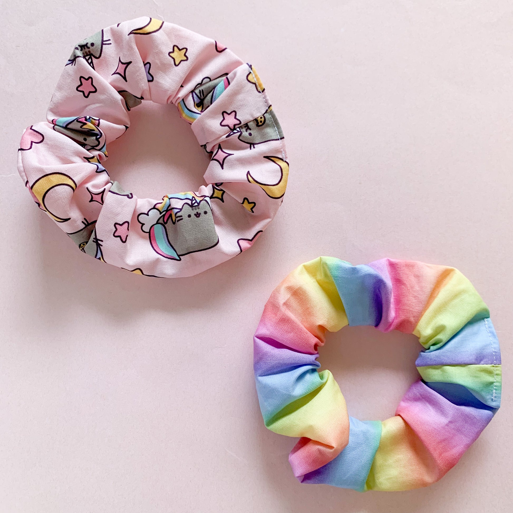Set of two handmade cotton scrunchies featuring Unicorn Pusheen on a soft pink background paired with rainbow is stripes in pastel colours. Buy individually or the set of two for a discount.