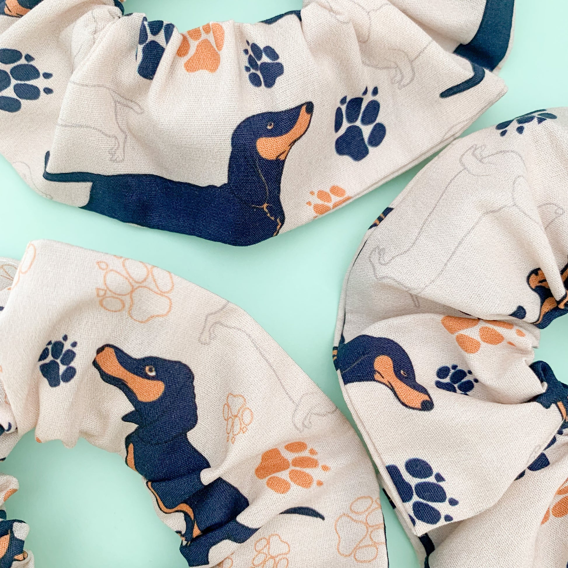 Handmade cotton scrunchie featuring Dachshunds on a tan background with paw prints.