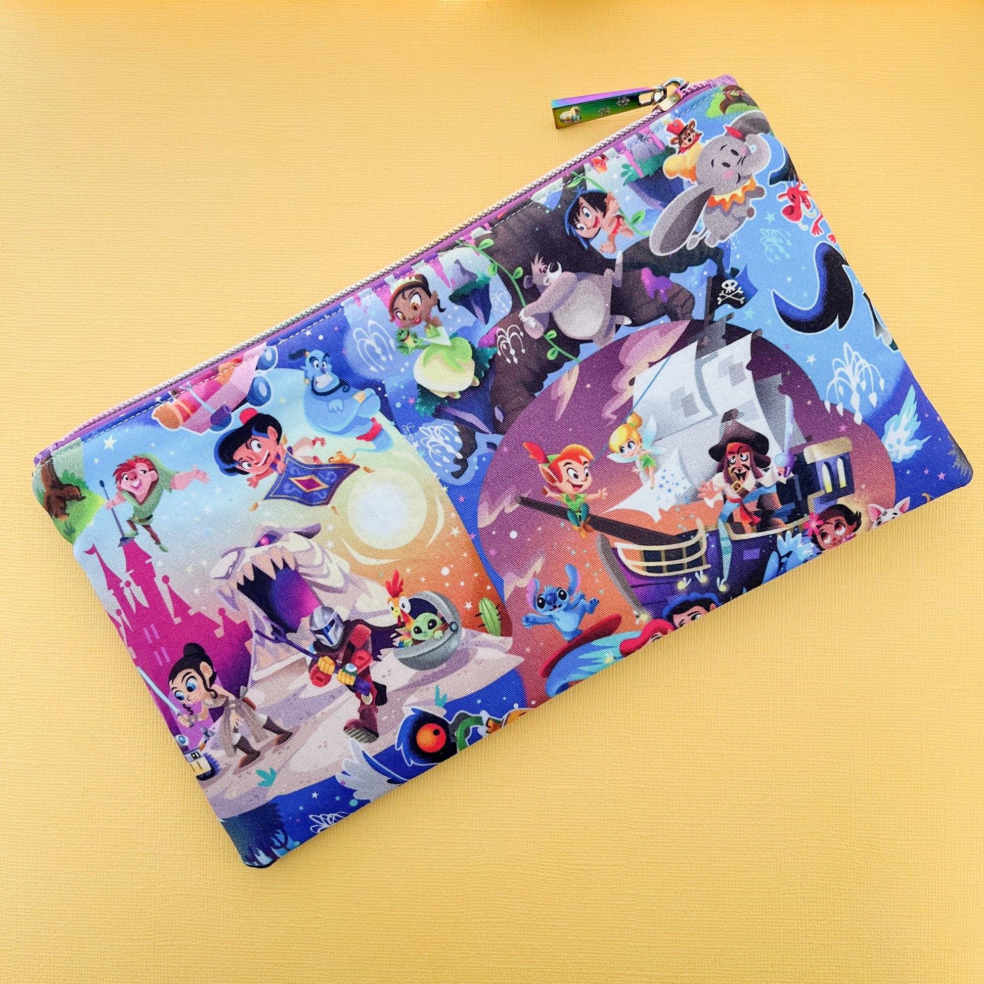 Fully lined zipper pouch featuring a mash up of Disney characters, finished with rainbow top stitching, a rainbow zipper and a cast metal pull featuring Mickey Ears and fireworks. It’s stabilised with padded interfacing to protect the contents and lined with a purple glitter cotton.