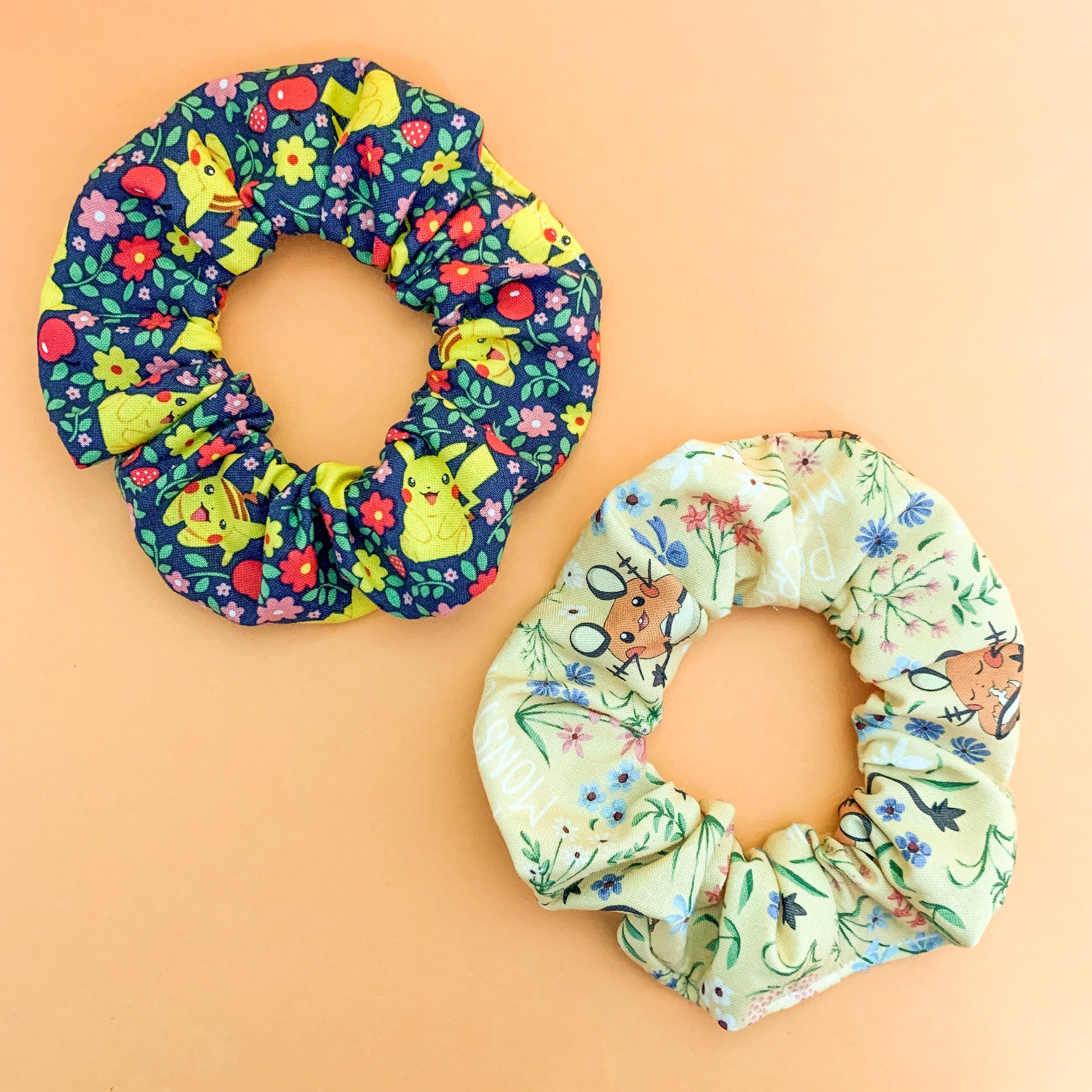 Set of two handmade cotton scrunchies featuring Pokémon, Pikachu and Dudenne on floral backgrounds. Chose your design or pick both at a discount.