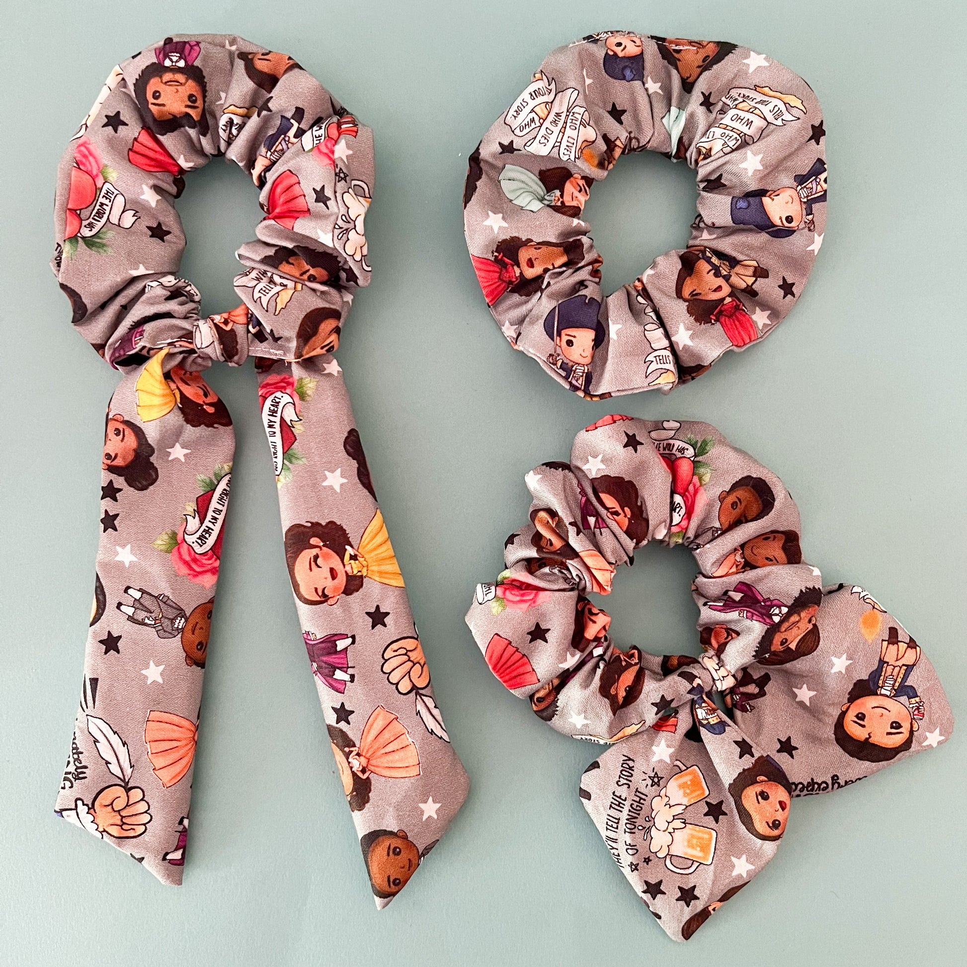 Celebrate your love for the greatest musical with this amazing Hamilton theme scrunchies, featuring characters and quotes on a soft grey background! Made of 100% cotton and strung with braided elastic.
