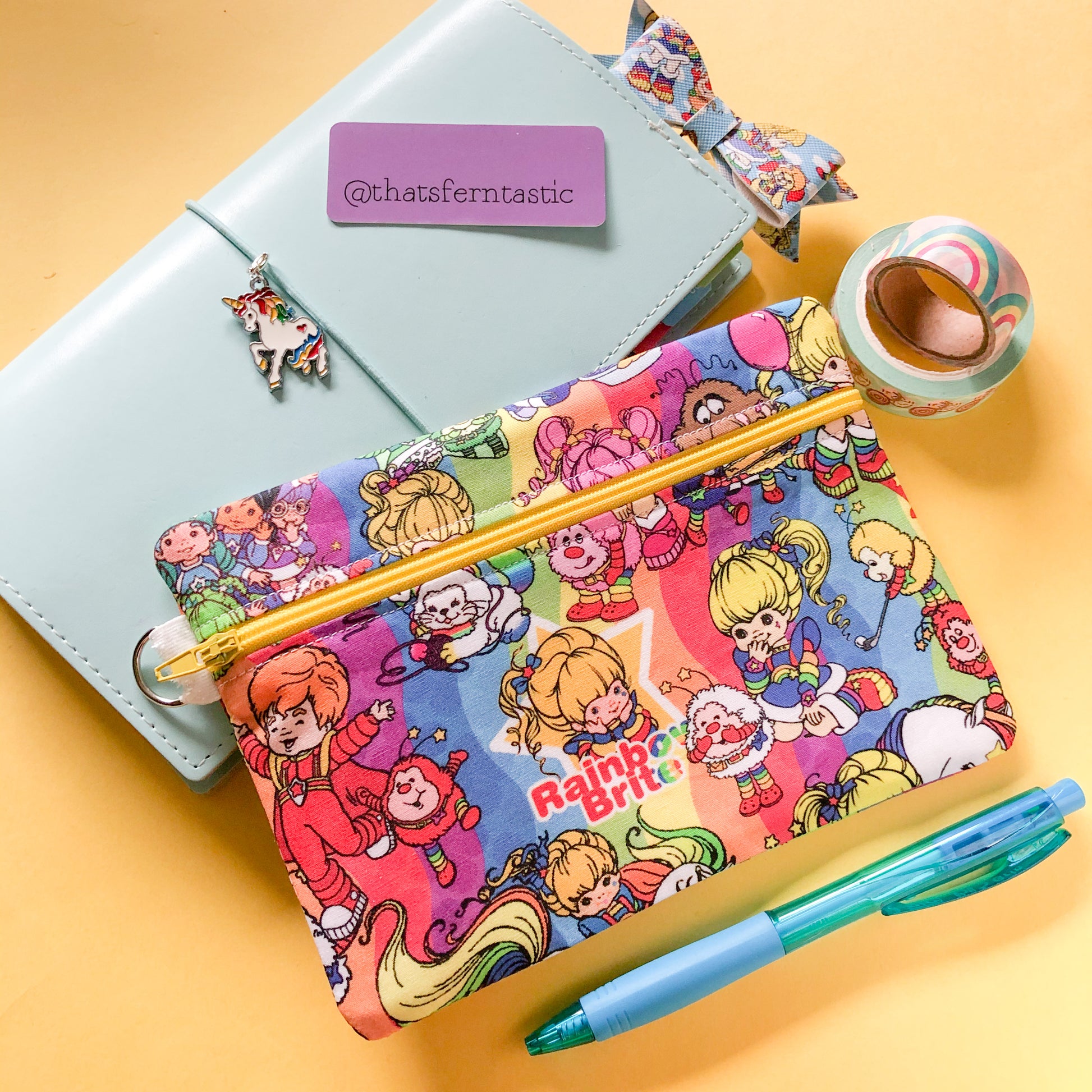 Fully lined Zipper Pouch featuring Rainbow Brite characters on a rainbow background, lined with a yellow spot fabric, finished with a quality blue zipper and double interfacing for additional stability.
